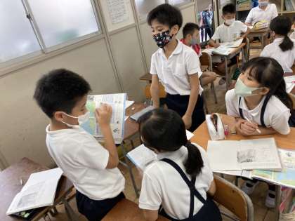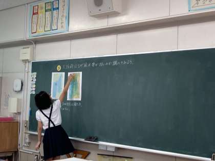 まず、「およそ7000万年前の大阪平野のようす」と「現在の大阪平野のようす」の資料で調べました。班で自分の意見を出し合ったり、クラス全体で話し合ったりしました。