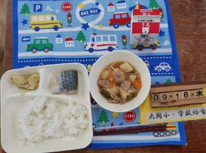 さごしの塩焼き、豚肉とじゃがいもの煮もの、キャベツの梅風味、ご飯、牛乳です。
