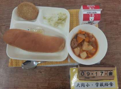 チキンレバーカツ、ケチャップ煮、キャベツのバジル風味サラダ、マーマレード、コッペパン、牛乳です。