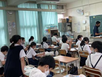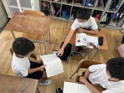 5年1組は社会科「水産業の盛んな地域」を学習しています。この時間は、長崎漁港の沖合漁業について学習しました。漁業を行っている様子の写真から「気が付くこと」や「わかること」をそれぞれたくさん書きだしました。子どもたちからは、「船が2隻あって、そのあいだの網に魚がたくさんいる。」や「暗いのでライトをつけながら漁をしている。夜なのかな?」「たくさんの人が協力しながら魚を獲っている。」などの意見が出ました。そして教科書を見ながら沖合漁業の方法を読み取り、「まきあみ漁で船団を組んだり、集魚灯を使って効率よく行っている。」とみんなでまとめることができました。最後に小テストを行いました。採点してみるとほとんどが満点で、「社会の用語」としてしっかり理解していることがわかりました。これからも楽しく社会を学んでいきたいと思います。