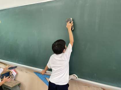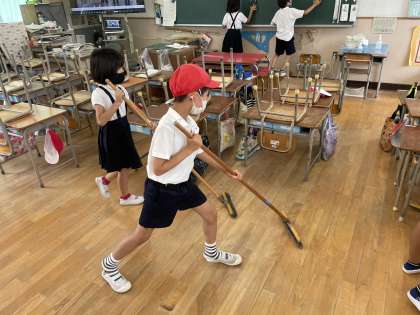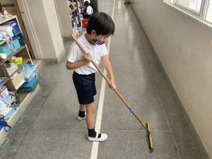 お昼休みが終わったあとに、子どもたちはそれぞれの担当場所をそうじします。みんな一生懸命きれいにしています。