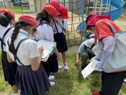 環境局から講師の先生方が来られ、学習園や池のまわり、正門付近、講堂周囲に別れて生き物さがしをしました。