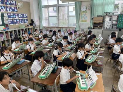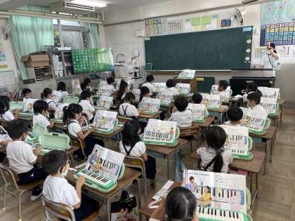 音楽では鍵盤ハーモニカを使って、「どんな音がするのかな」の学習をしました。先生の話をよく聞きながら、リズムよく音を鳴らしていました。