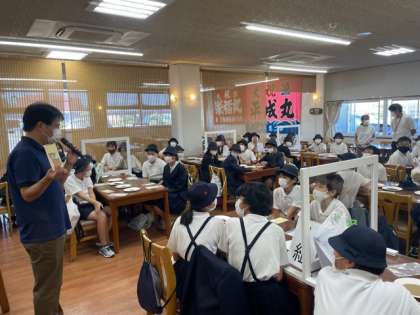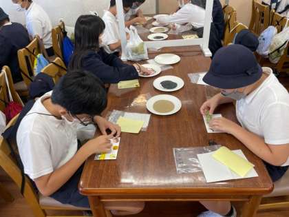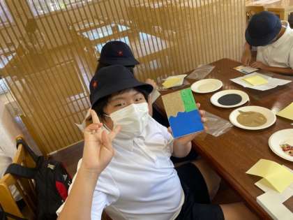 砂絵づくりです。子どもたちは、学校で考えてきたデザインをもとに、砂丘の砂と砂鉄、スパンコールを使って、思い思いに工夫した自分だけのポストカードを作成しました。