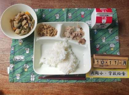 豚肉のねぎしょうゆ焼き、ふきよせ煮、ツナ大豆そぼろ、ご飯、牛乳です。