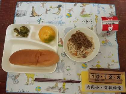 タンタンめん、きゅうりの甘酢づけ、みかん、こくとうパン、牛乳です。