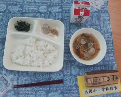 鶏肉のゆず塩焼き、ソーキ汁、ほうれん草のおひたし、ごはん、牛乳です。