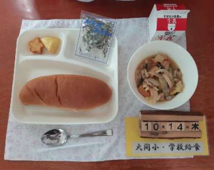 豚肉といかの中華煮、大学いも、ミニフィッシュ、こくとうパン、牛乳です。