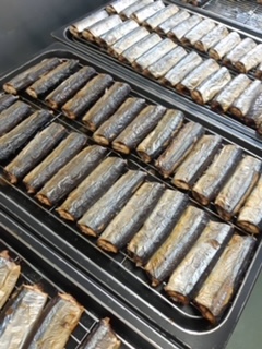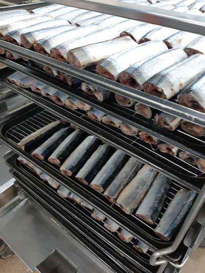 網を敷いたホテルパンに並べて、蒸し焼きモードで焼きます。だいこんおろし、みりん、うすくちしょうゆを合わせて煮、最後にゆずを加えて煮配缶時にさんまにかけています。