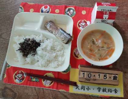 さんまのみぞれかけ、みそ汁、牛ひじきそぼろ、ご飯、牛乳です。
