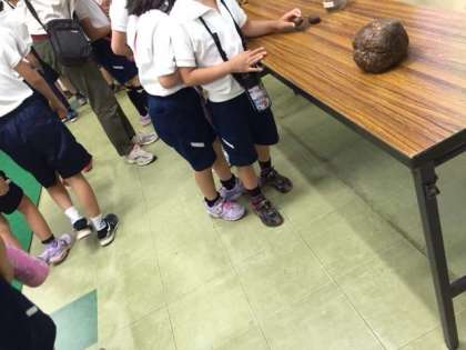 写真はいろんな動物のウンチを見せてもらっているところです。