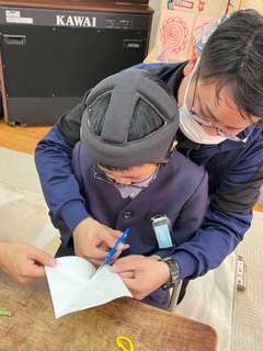折り紙とストローで作りました。のりを使って上手に羽根の部分を作ることができました。かすかな風で風車がくるくると回りました。