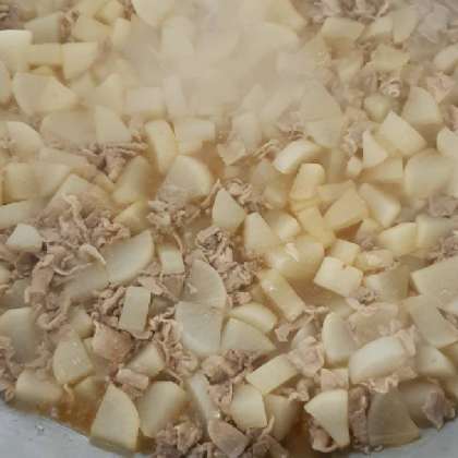 今日のだいこんの煮ものは、だしこんぶとけずりぶしでだしをとり、豚肉、だいこんの順に加えて煮ています。煮上がれば、みりん、うすくちしょうゆで味つけし、水どきでんぷんでとろみをつけています。