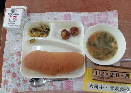 あげシューマイ、とうふのスープ、ツナとチンゲンサイのいためもの、こくとうパン、牛乳です。