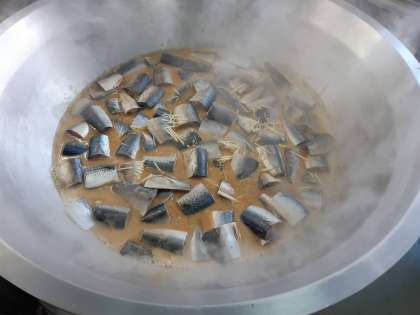 さばのみそ煮は、だしこんぶを敷き、湯、しょうが砂糖、みりん、赤みそを加えて煮、さばを加えて上からこんぶで落し蓋をして煮含めています。