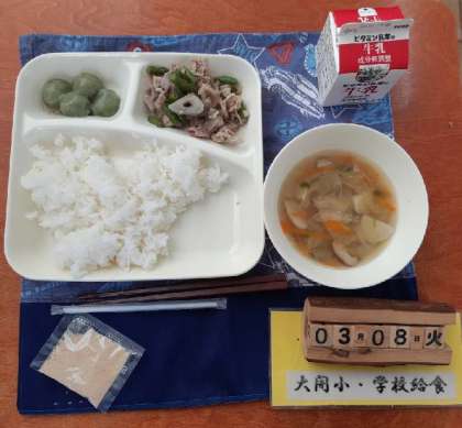豚肉とれんこんのいため煮、五目汁、きな粉よもぎだんご、ご飯、牛乳です。