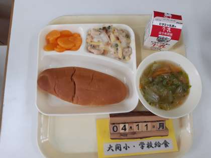 マカロニグラタン、レタスのスープ、みかん(缶)、こくとうパン、牛乳です。