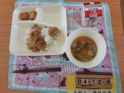 鶏肉とじゃがいもの煮もの、あつあげのしょうゆだれかけ、紅ざけそぼろ、ご飯、牛乳です。