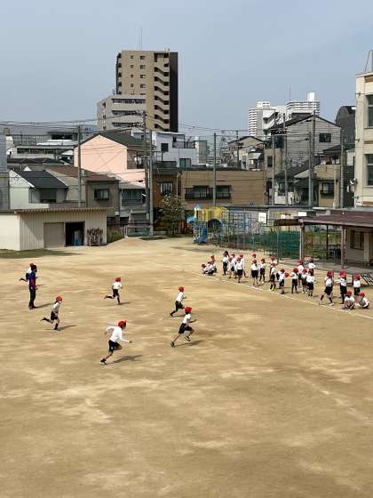 3年生が運動場で体育の学習を行いました。いろいろな走り方をしたり、合図に合わせて止まったりしながら、児童は