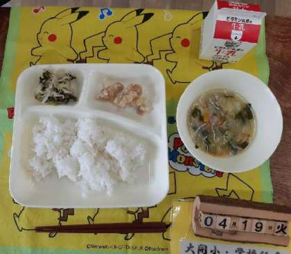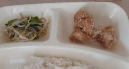 鶏肉のからあげ、中華スープ、チンゲンサイともやしの甘酢あえ、ご飯、牛乳です。