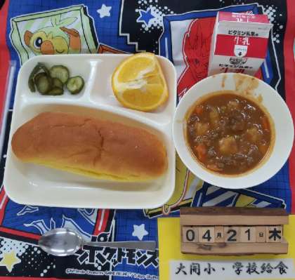 ビーフシチュー、きゅうりのサラダ、あまなつかん、パンプキンパン、牛乳です。