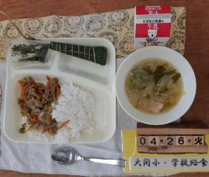 きんぴらちらし、すまし汁、ちまき、ご飯(減量)です。