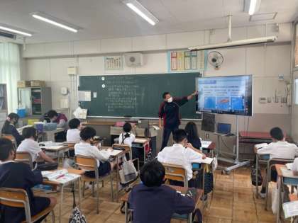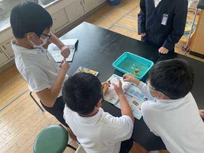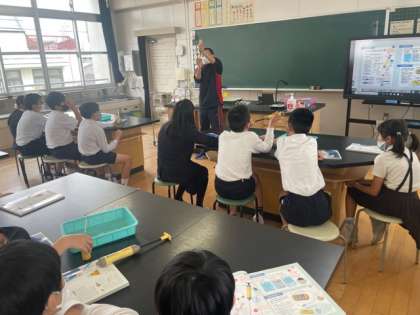 理科では、ものが燃えるとき、空気中の気体にはどんな変化があるのか、気体検知官や石灰水を使って調べました。初めて使う実験器具に戸惑いながらも、グループで協力して調べることができました。