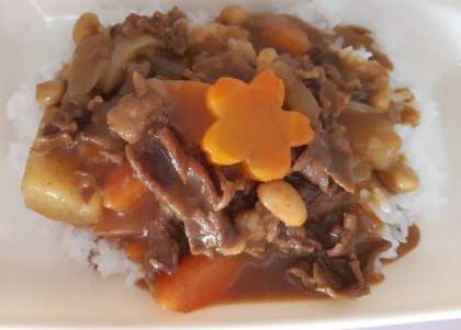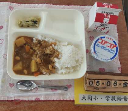 牛肉と大豆のカレーライス、キャベツのひじきドレッシング、ヨーグルト、ご飯、牛乳です。