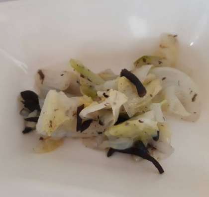 キャベツのひじきドレッシングは、キャベツは蒸します。戻したひじきをからいりして、砂糖、塩、米酢、うすくちしょうゆで味つけして煮、火を止めて油を加えます。キャベツにかけあえています。