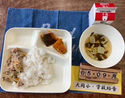 豚丼、湯葉のすまし汁、かぼちゃのしょうゆ焼き、ご飯、牛乳です。
