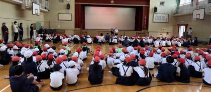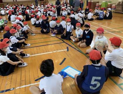 にこにこ班に分かれて集会を行いました。班ごとに円になり、ゴロピカドンのゲームで盛り上がりました。
