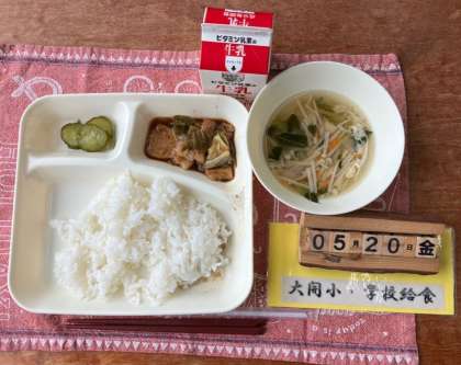 ホイコウロー、鶏肉と野菜の中華スープ、きゅうりのピリ辛和え、ご飯、牛乳です。