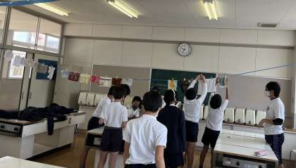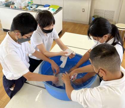 6年家庭科で、洗濯の仕方について、学びました。手洗いでハンカチをもみ洗いした後、並べて干しました。