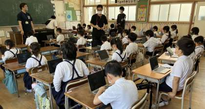 パソコンの使い方を学びました。一年生のときのタブレットパソコンとは違う使い方を教えてもらい、みんな熱心に聞いていました。