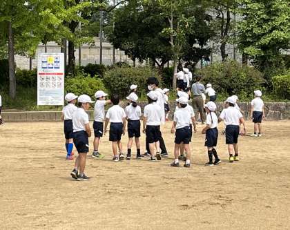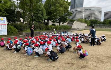 大阪城公園につきました。お話を聞いて、今から広場であそびます。