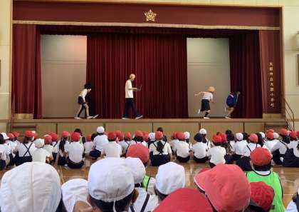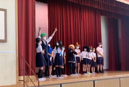 今日の集会では、「カーテンの後ろには何人いるかな?」のゲームをしました。変装をした子どもや大人が行ったり来たりすると、子どもたちは大盛り上がりとなり、集中して数えるのはとても難しかったです。