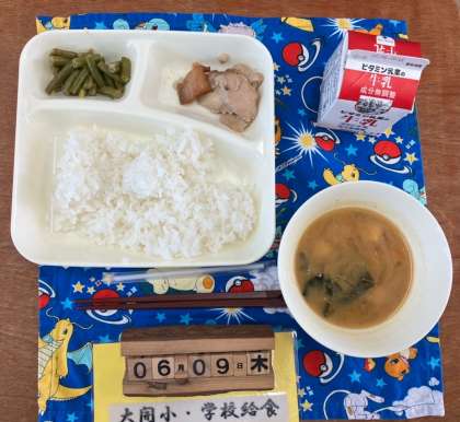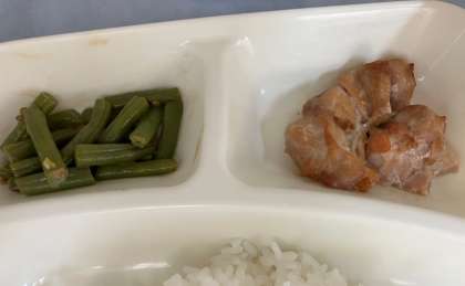 鶏肉のしょうゆバター焼き、とうふのみそ汁、さんどまめのごまあえ、ご飯、牛乳です。
