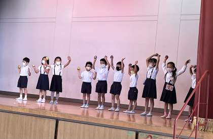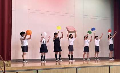 集会で、子どもまつりのCMを発表しました。各学級は、短い時間にお店の紹介を詰め込んでお客さんに来てもらえるように呼びかけました。