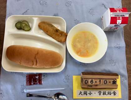 サーモンフライ、豆乳スープ、きゅうりのバジル風味サラダ、コッペパン、いちごジャム、牛乳です。