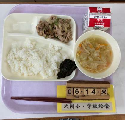 豚肉のごまみそ焼き、すまし汁、のりのつくだ煮、ご飯、牛乳です。