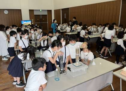 部屋の中で、淀川の水をきれいに濾過する実験をしています。