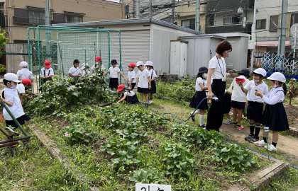 学習園で育てている、ピーマンやきゅうりがたくさん実をつけていました。収穫したピーマンを持って、嬉しそうに見せてくれました。
