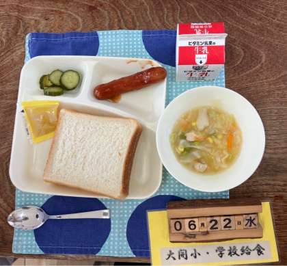 ウィンナーのケチャップソース、スープ、きゅうりのサラダ、食パン、アプリコットジャム、牛乳です。
