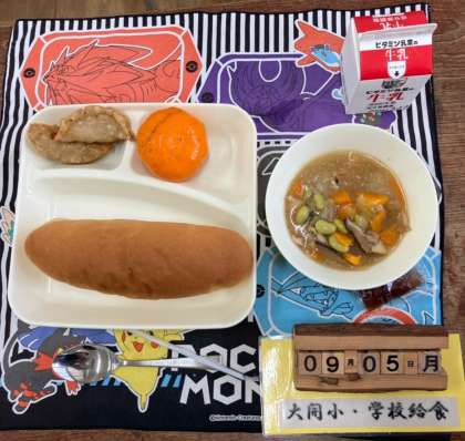 あげぎょうざ、鶏肉ととうがんの中華煮、みかん(冷)、いちごジャム、コッペパン、牛乳です。