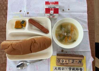ウィンナーのケチャップソース、スープ、焼きかぼちゃ、黒糖パン、牛乳です。