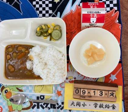 チキンカレーライス(米粉)、きゅうりとコーンのサラダ、白桃(カット缶)です。