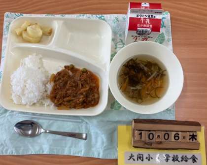 タコライス、もずくのスープ、焼きじゃが、ご飯、牛乳です。