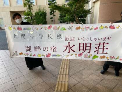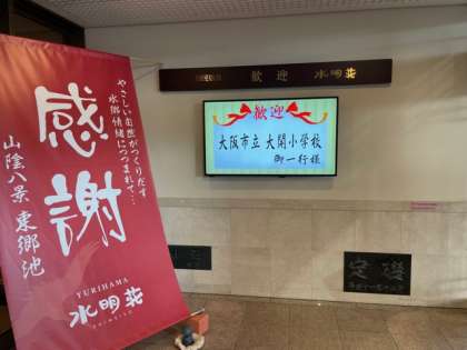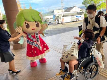 宿に到着しました。ご当地キャラクターのゆりりんちゃんをはじめ、水明荘の皆様がお迎えくださいました。