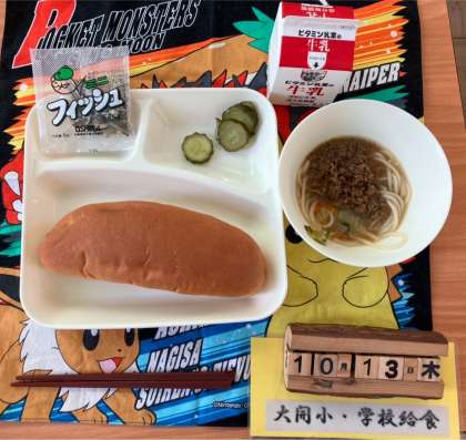 タンタンめん、きゅうりの甘酢づけ、ミニフィッシュ、こくとうパン、牛乳です。