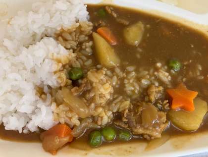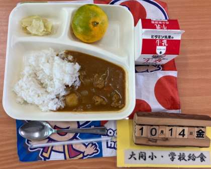 ポークカレーライス(米粉)、サワーキャベツ、みかん、ご飯、牛乳です。